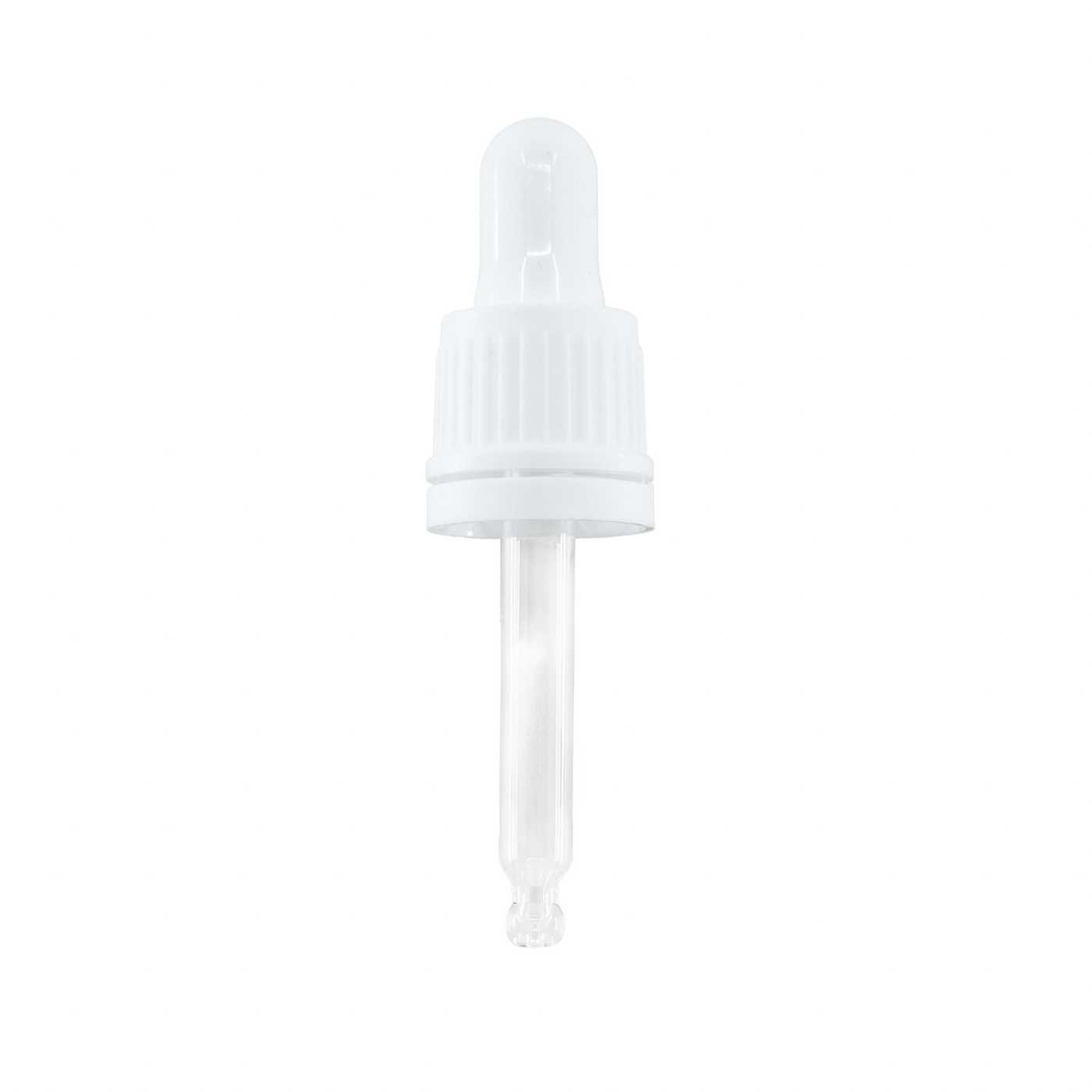 Weißer Kunststofftropfer, passend für eine Flasche mit einem Halsdurchmesser von 18 mm und einem Volumen von 10-15 ml.Länge des Glasröhrchens: 57 mm