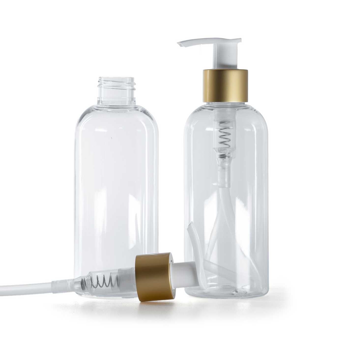 Runde transparente Kunststoffflasche, weißer Lotionpumpe mit mattem Goldkragen, 200 ml