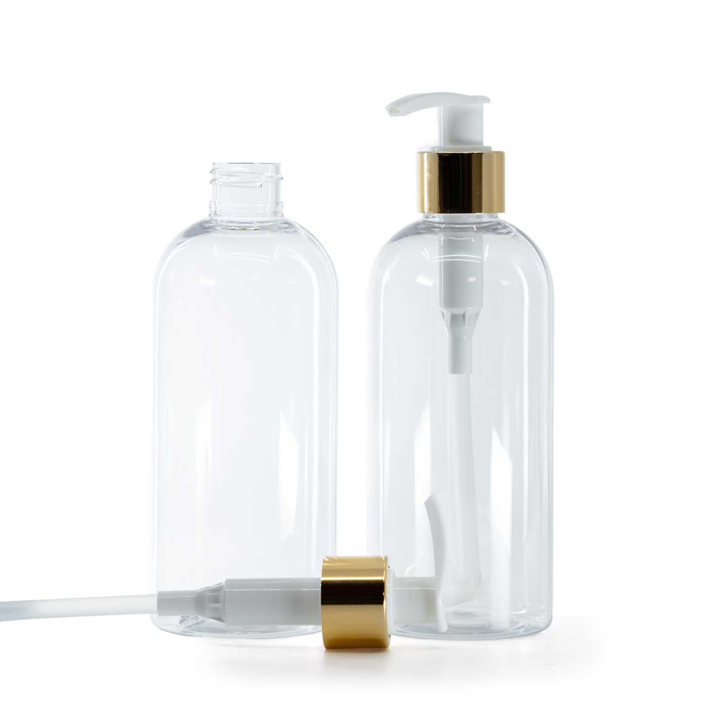 Runde transparente Kunststoffflasche, weißer Spender mit glänzend-goldener Manschette, 300 ml