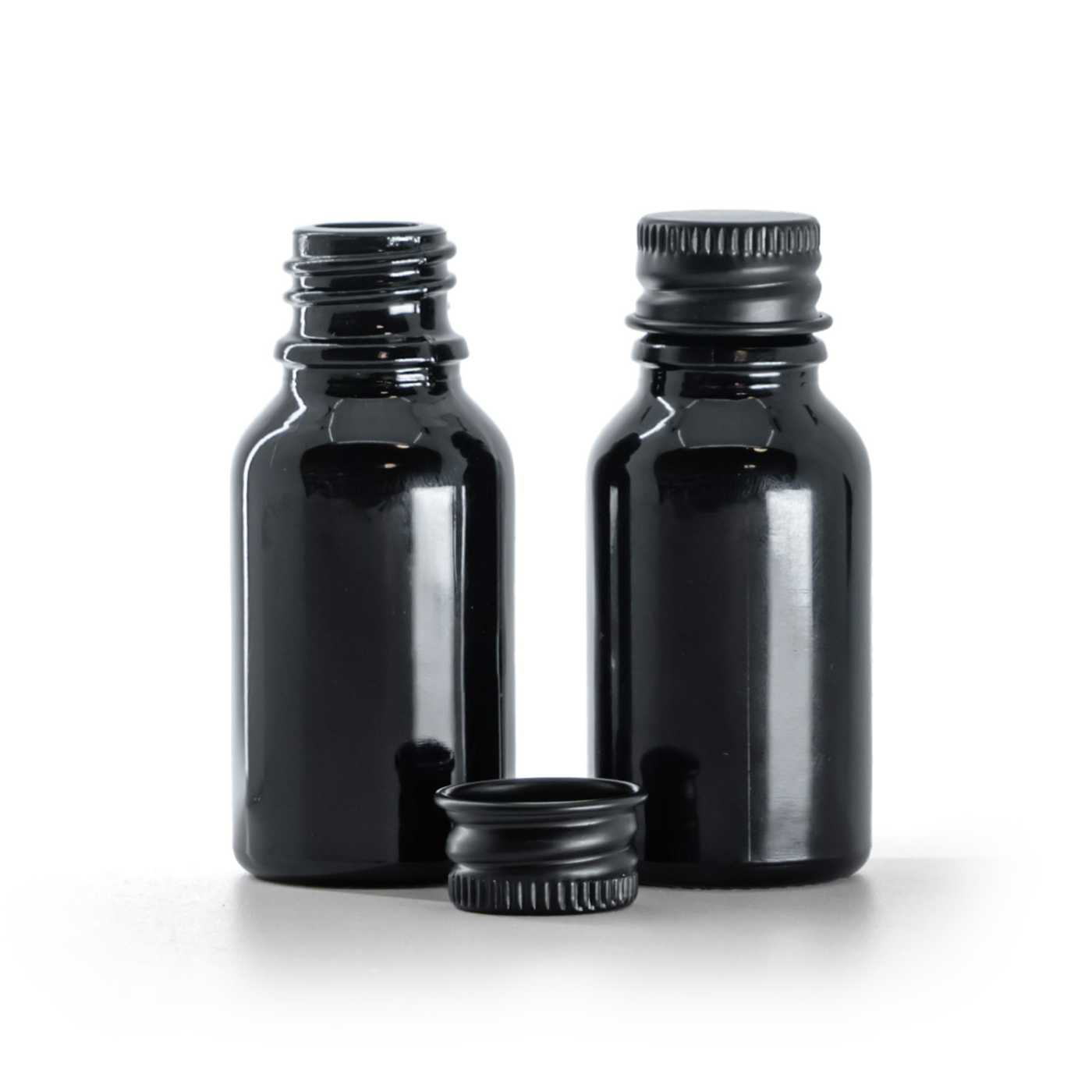 Schwarz glänzende Glasflasche, schwarzer Aluminiumdeckel, 15 ml