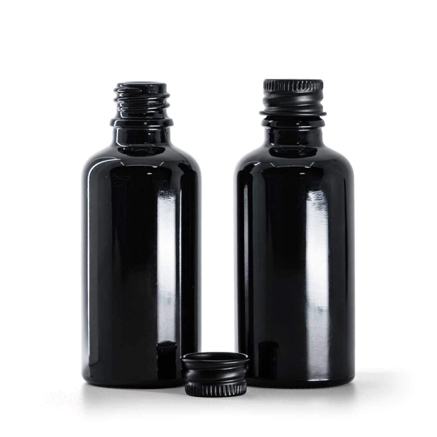 Schwarz glänzende Glasflasche, schwarzer Aluminiumdeckel, 50 ml