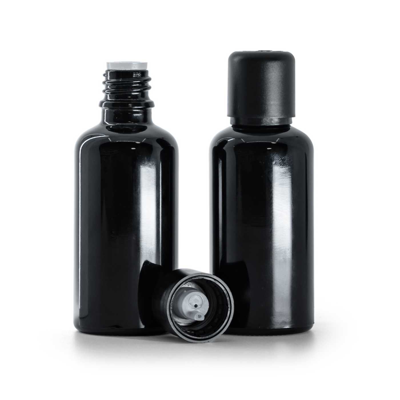 Schwarz glänzende Glasflasche, schwarzer Sicherheitsverschluss und Tropfer, 50 ml