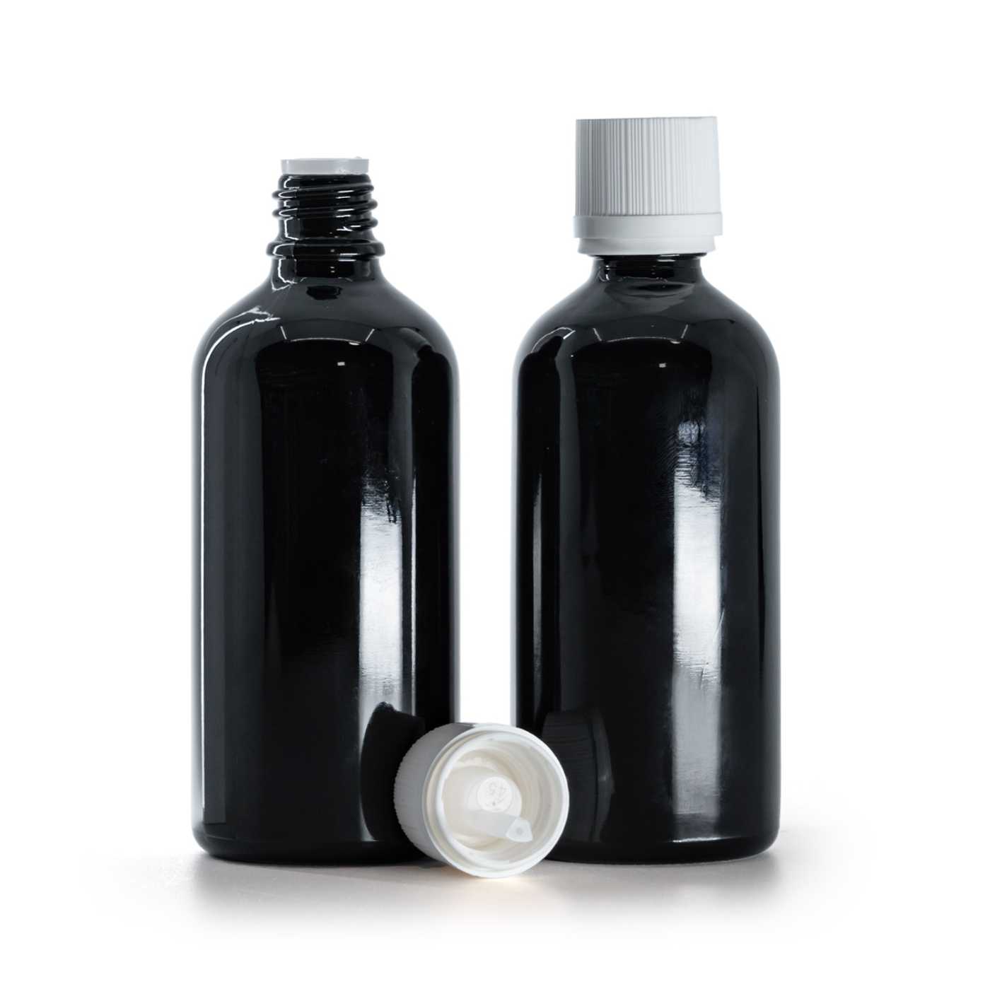 Die Glasflasche, das so genannte Fläschchen, ist aus hochwertigem schwarzem Glas mit glänzender Oberfläche gefertigt. Diese sorgt dafür, dass kein Licht in die Flasche eindringt und bietet somit Schutz vor UVA- und UVB-Strahlen.