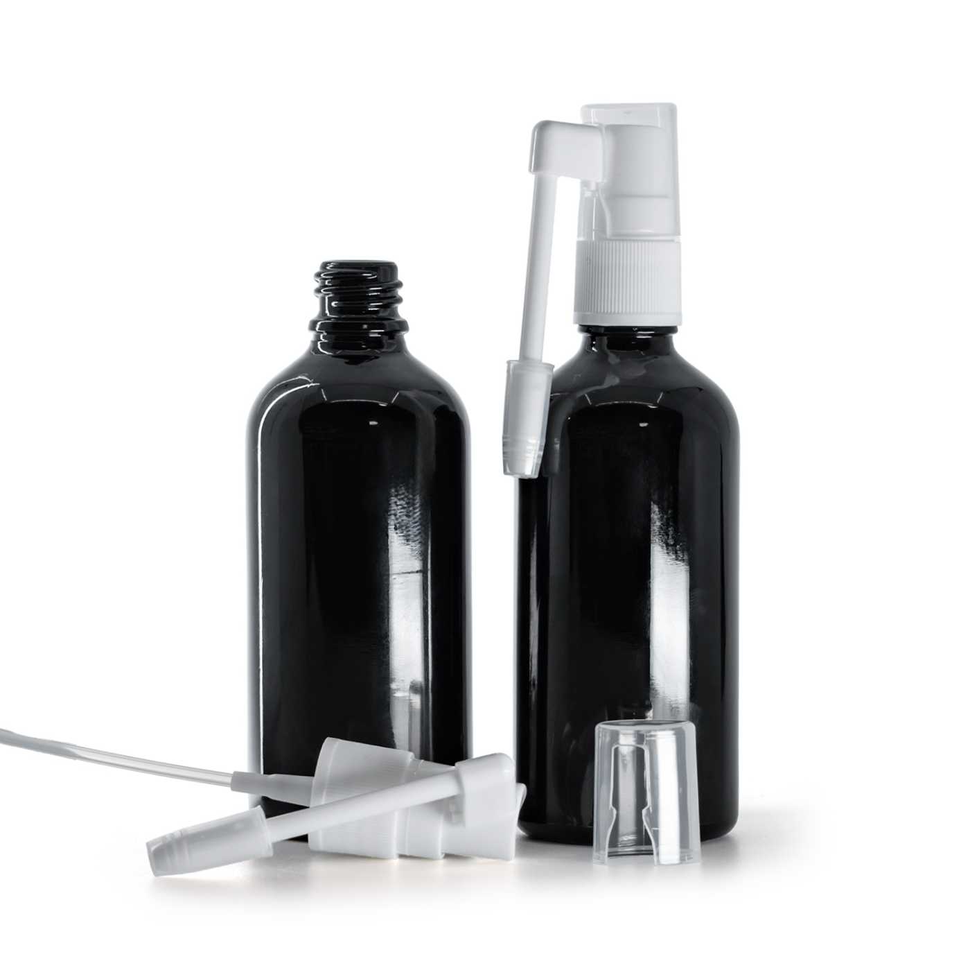 Halsflüssigkeitsapplikator aus Kunststoff in weißer Farbe. Der Mundspray ist für die Kombination mit allen Glasflaschen mit 18 mm Hals geeignet.
