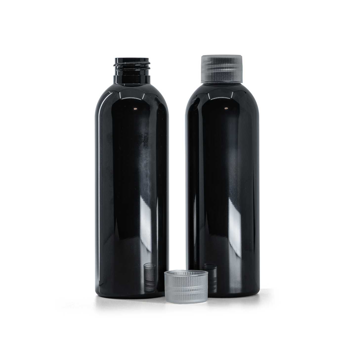 Schwarze glänzende Kunststoffflasche mit transparentem Verschluss, 200 ml