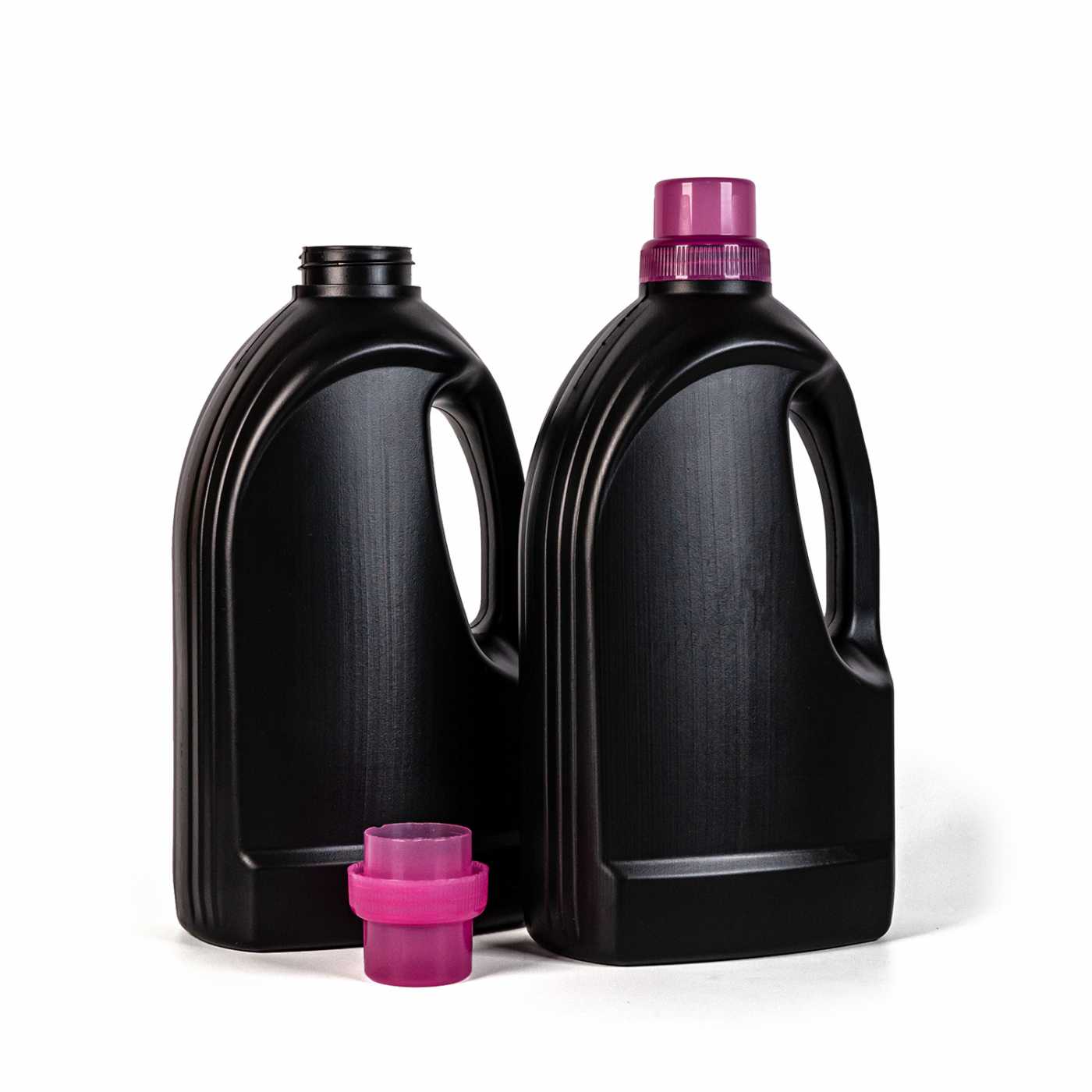 Schwarze Plastikflasche für Reinigungsmittel, rosa Kappe, 1,5 l