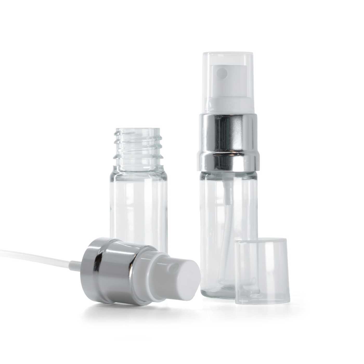 Transparente Kunststoffflasche mit weiß-silbernem Sprühaufsatz 10 ml