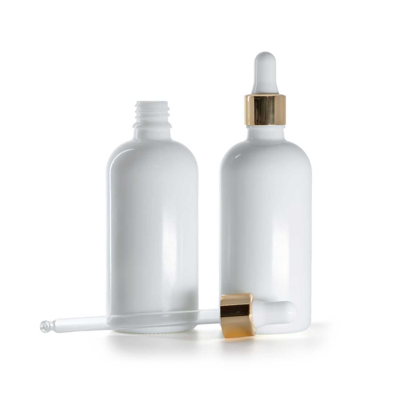 Weiße Glasflasche mit weiß-goldener Pipette, 100 ml