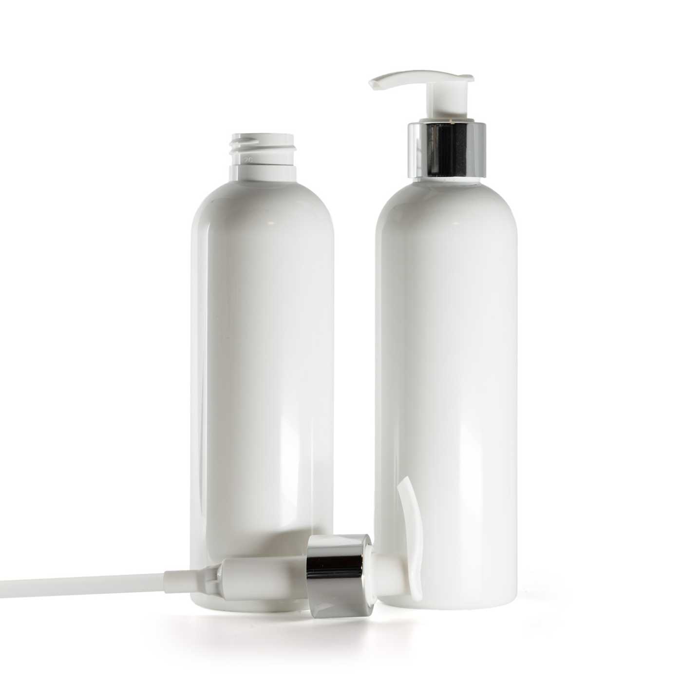 Weiße Kunststoff-Flasche, weiße Lotion-Pumpe mit glänzendem Silberkragen, 250 ml