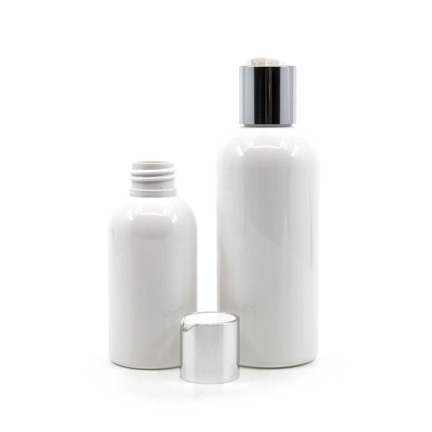 Weiße Kunststoffflasche mit silbernem Flip-Top-Verschluss 150 ml