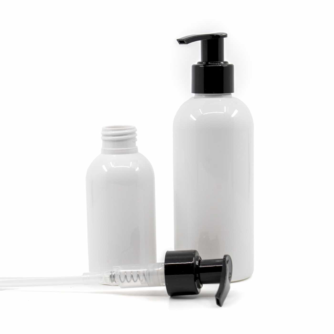 Weiße Kunststoffflasche, schwarze glatte Pumpe, 150 ml