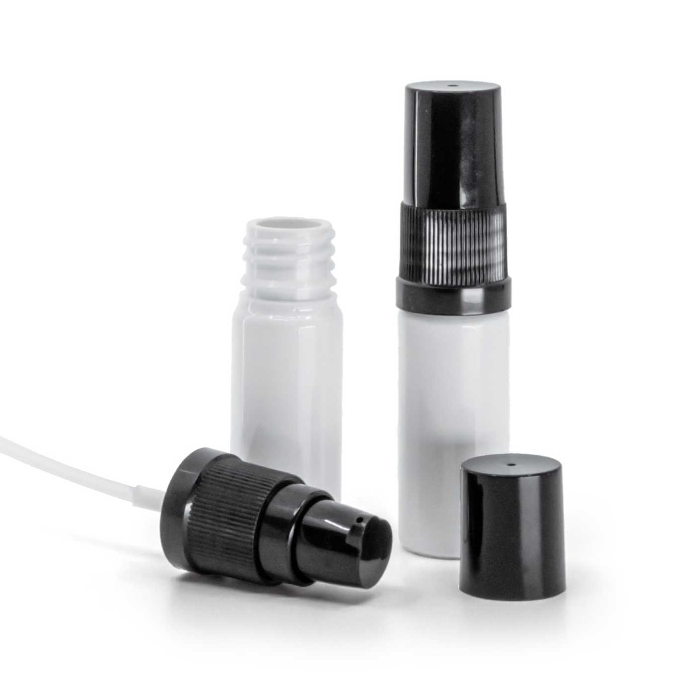 Weiße Kunststoffflasche, schwarze Lotion-Pumpe mit schwarzem Überkappe, 10 ml