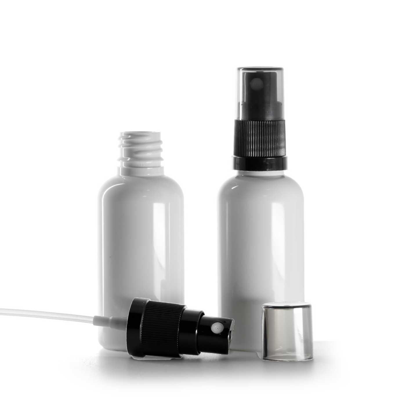 Weiße Kunststoffflasche, schwarzer Sprüher für feinen Nebel, rauchfarbener Überkappe, 50 ml