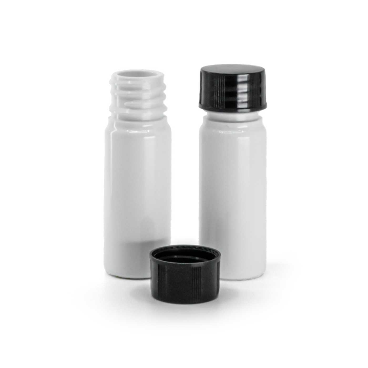 Weiße Kunststoffflasche, schwarzer Verschluss, 10 ml