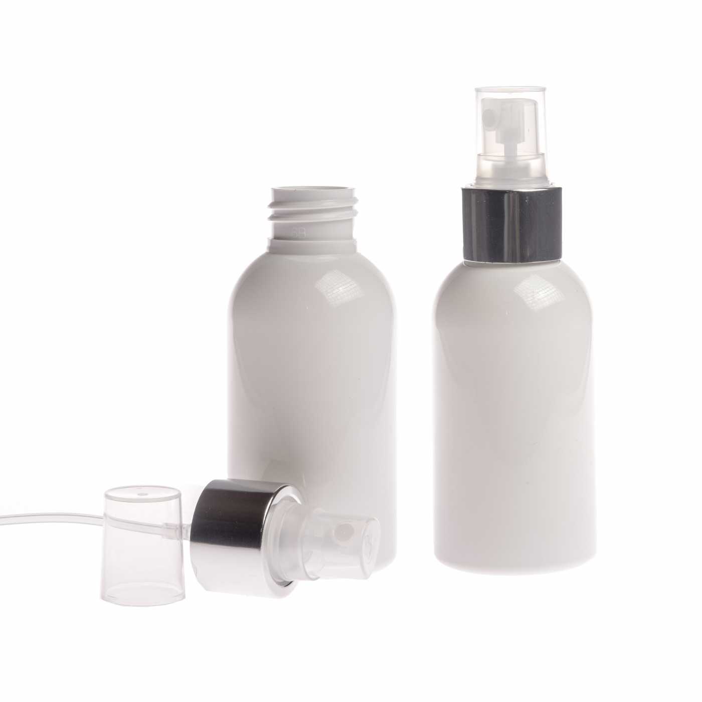 Transparenter Kunststoffzerstäuber mit transparentem Deckel in Silberglanz mit einem Durchmesser von 24 mm.