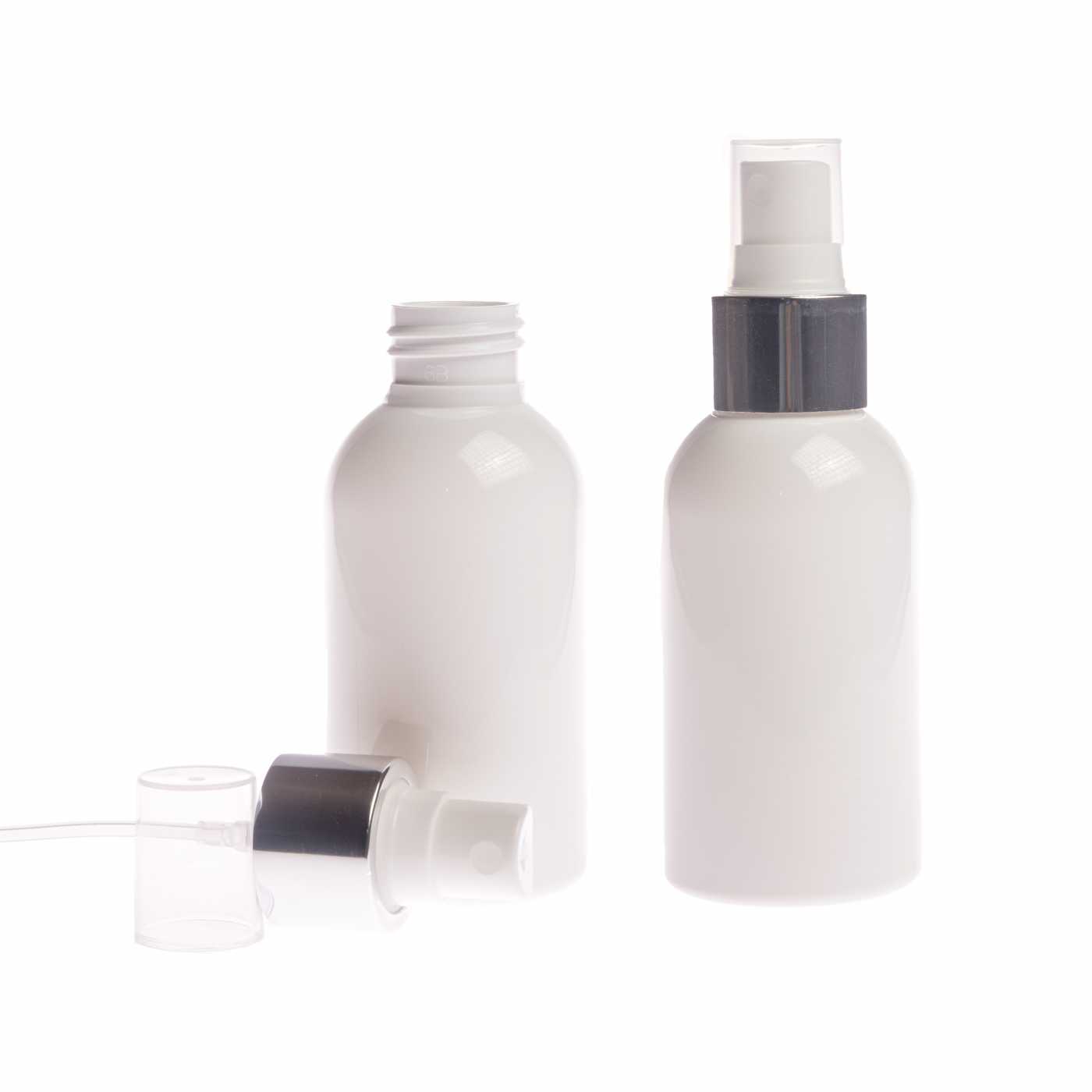 Weißer Kunststoffspender mit transparentem Deckel und Hals in Silberglanz mit einem Durchmesser von 24 mm.