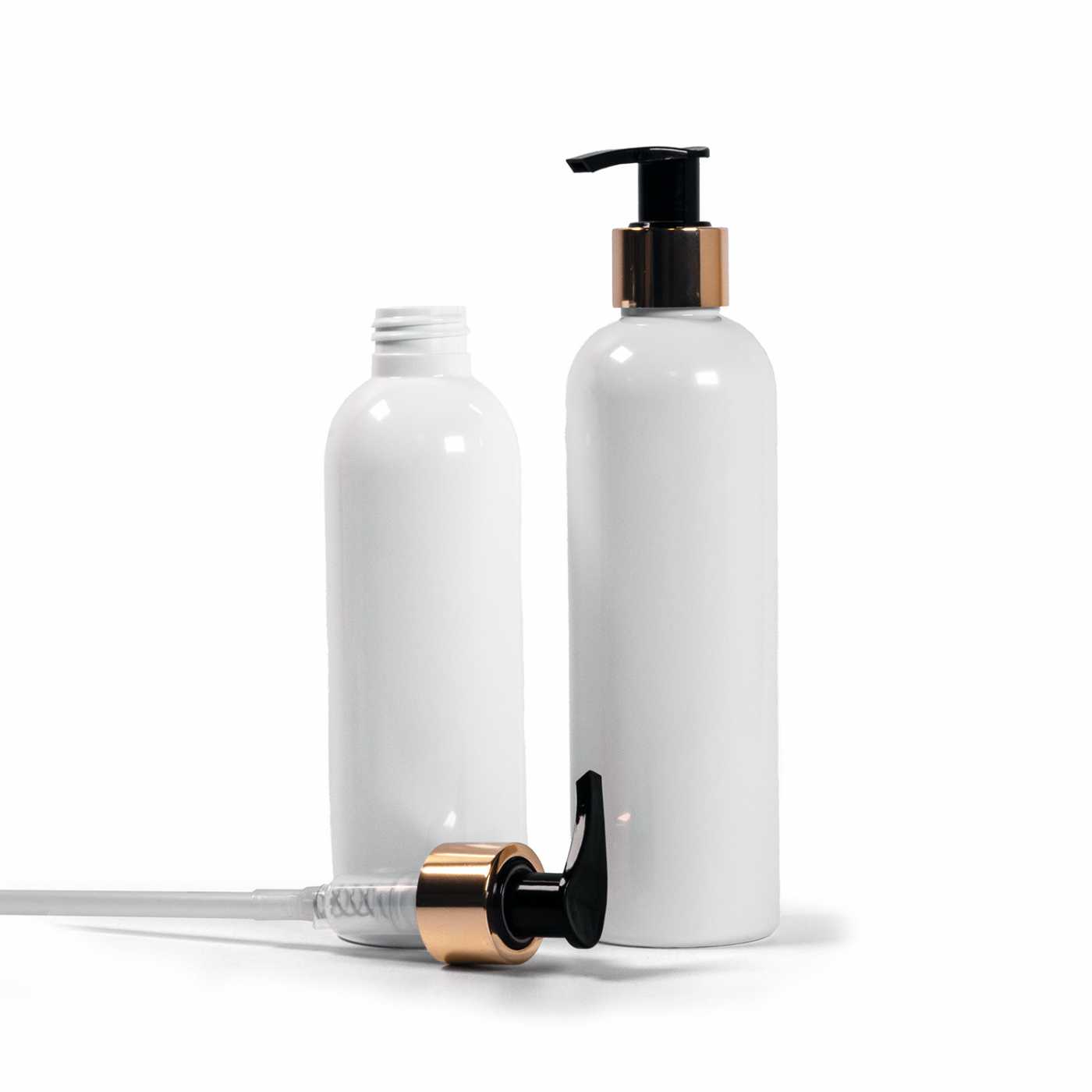 Weiße Plastikflasche, goldene Pumpe, 250 ml