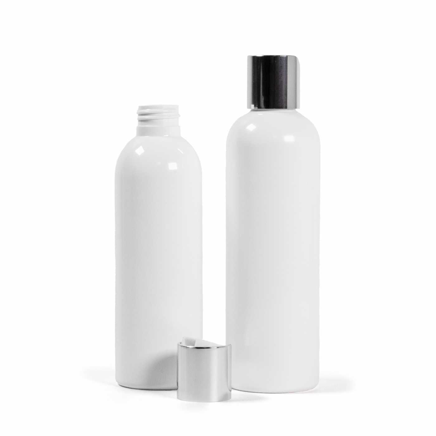 Weiße Kunststoffflasche aus PET mit glänzender Oberfläche.