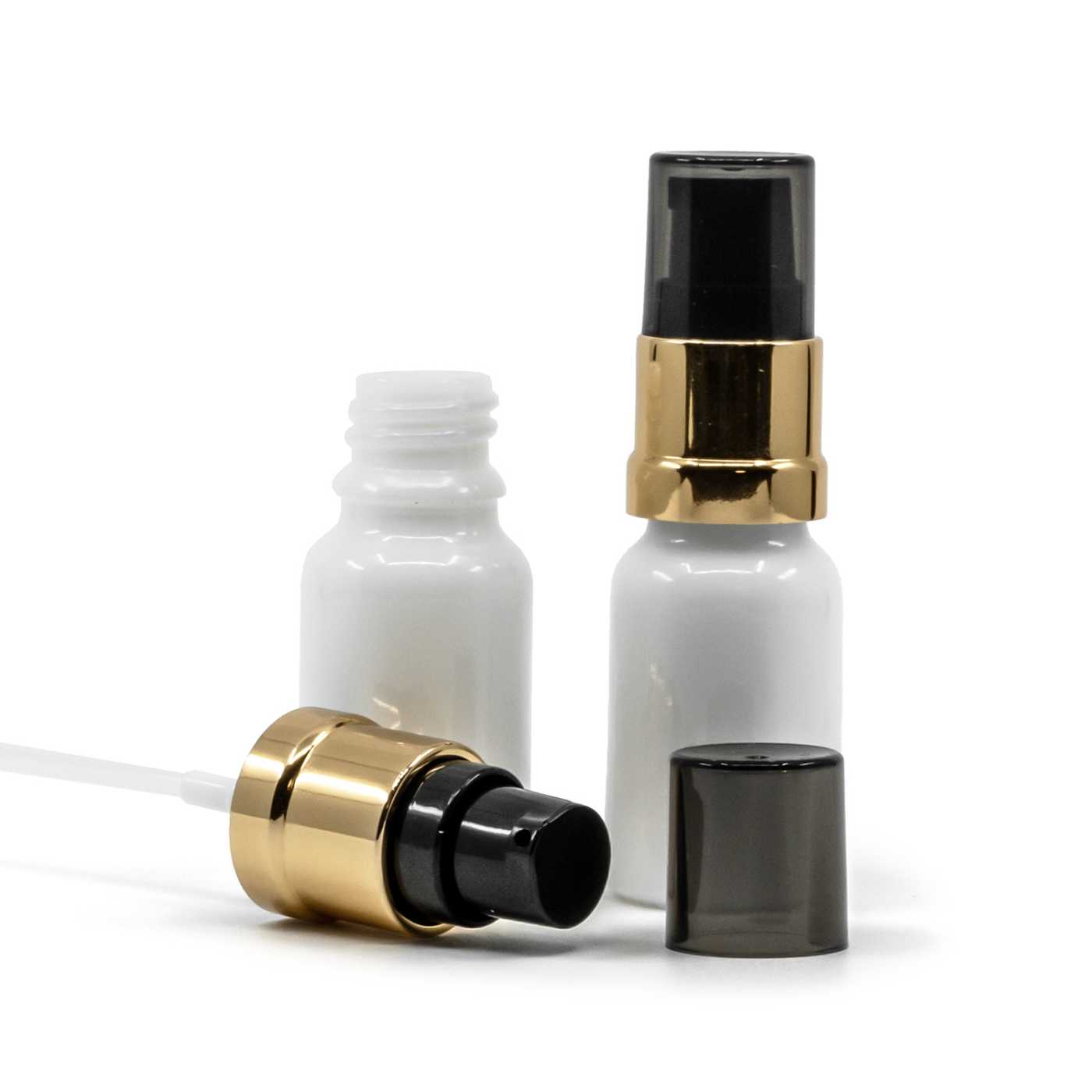 Weißes Glasfläschchen, goldglänzende schwarze Pumpe, 10 ml