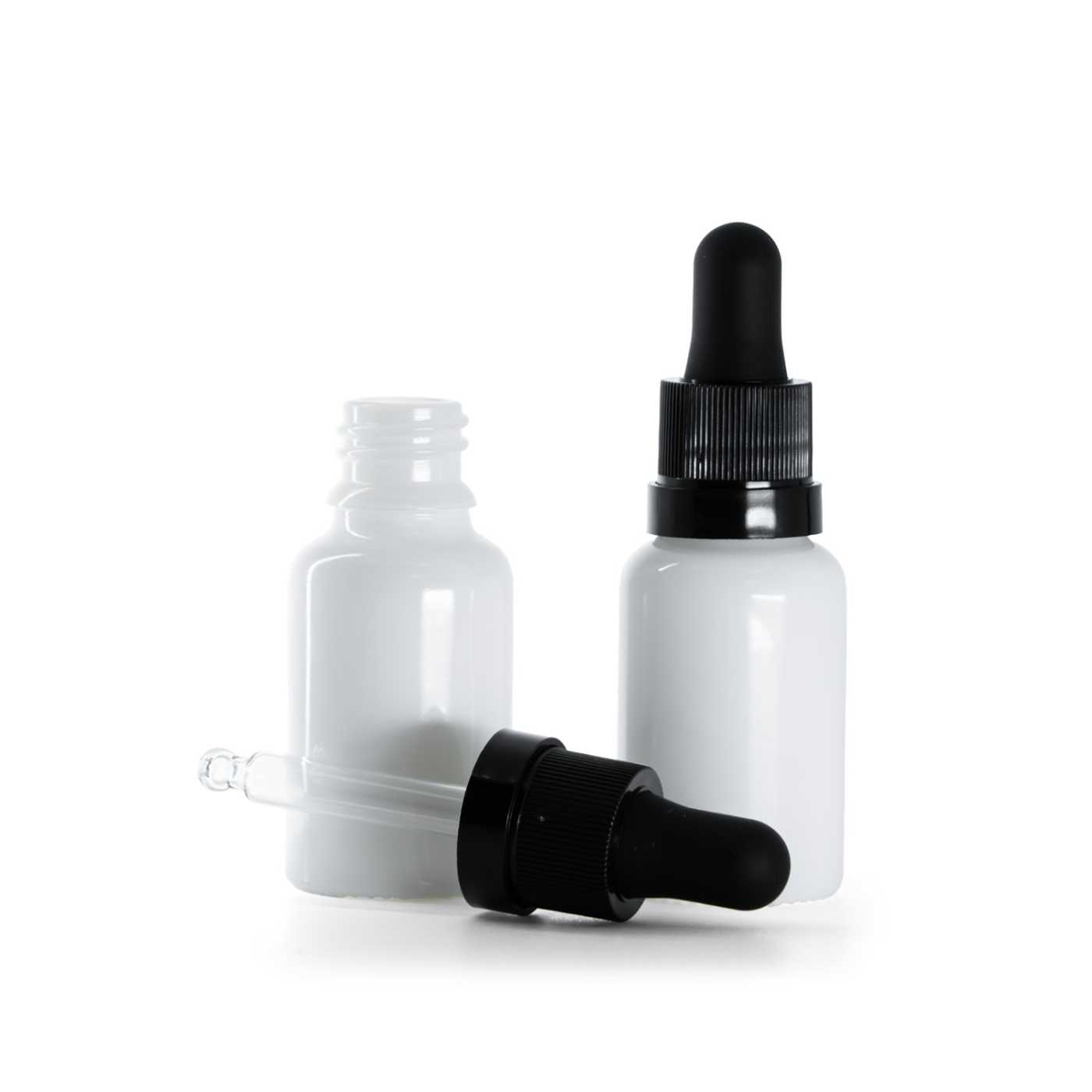 Weißes Glasfläschchen, mattschwarzer Tropfer mit glänzendem Streifen, 15 ml