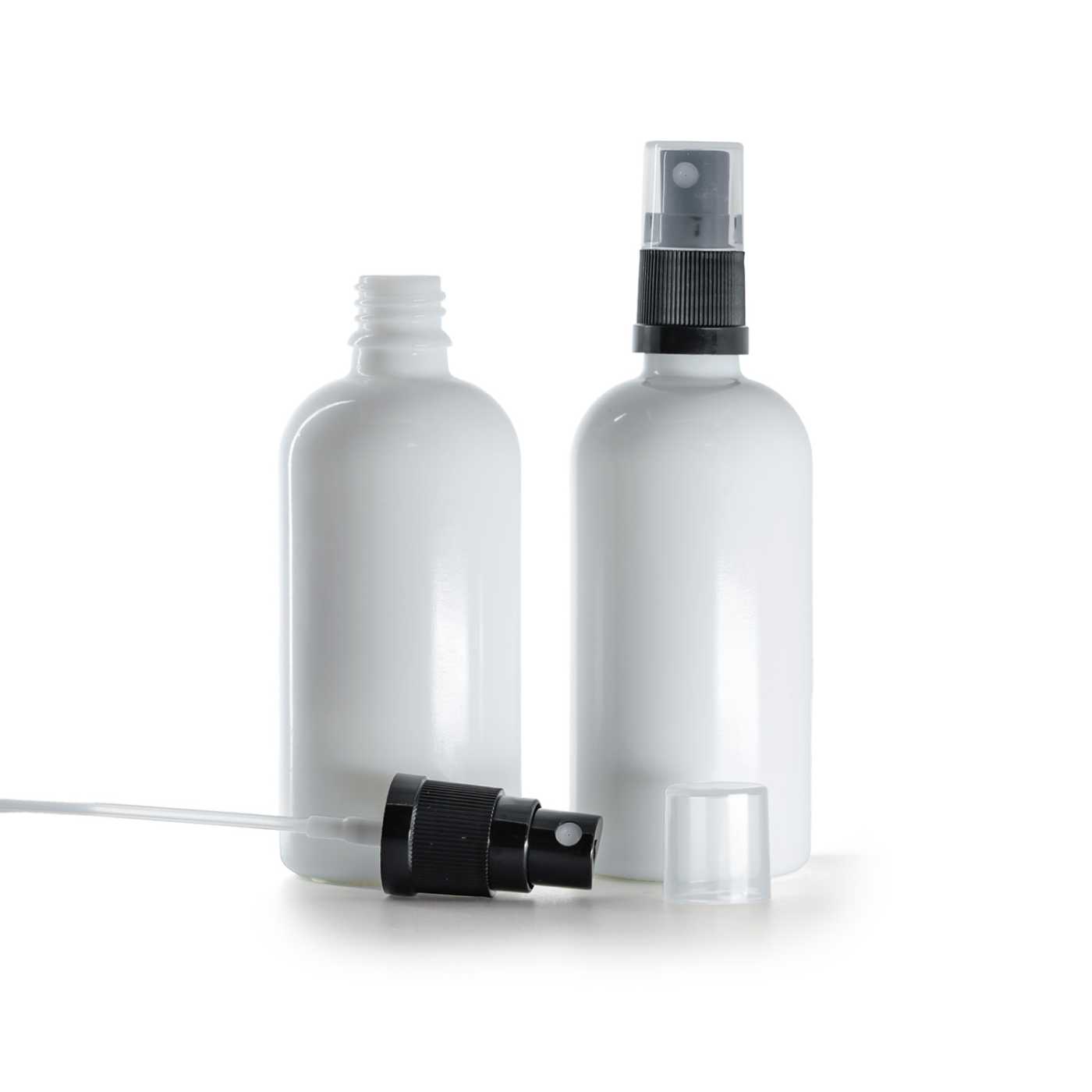 Weißes Glasfläschchen mit schwarzem Zerstäuber, 100 ml