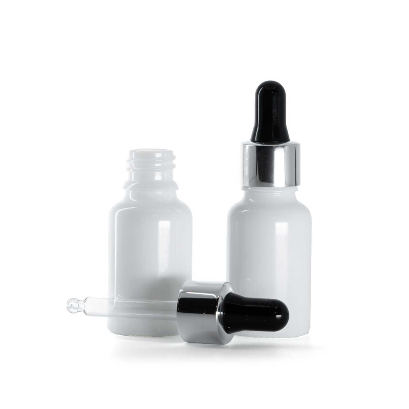 Glastropfer, schwarz/silber glänzend, passend für Flasche mit Halsdurchmesser 18 mm und Volumen 15 ml.Länge des Glasrohrs: 56 mmMaterial: Glas, Silikon, Aluminium, Kunststoff