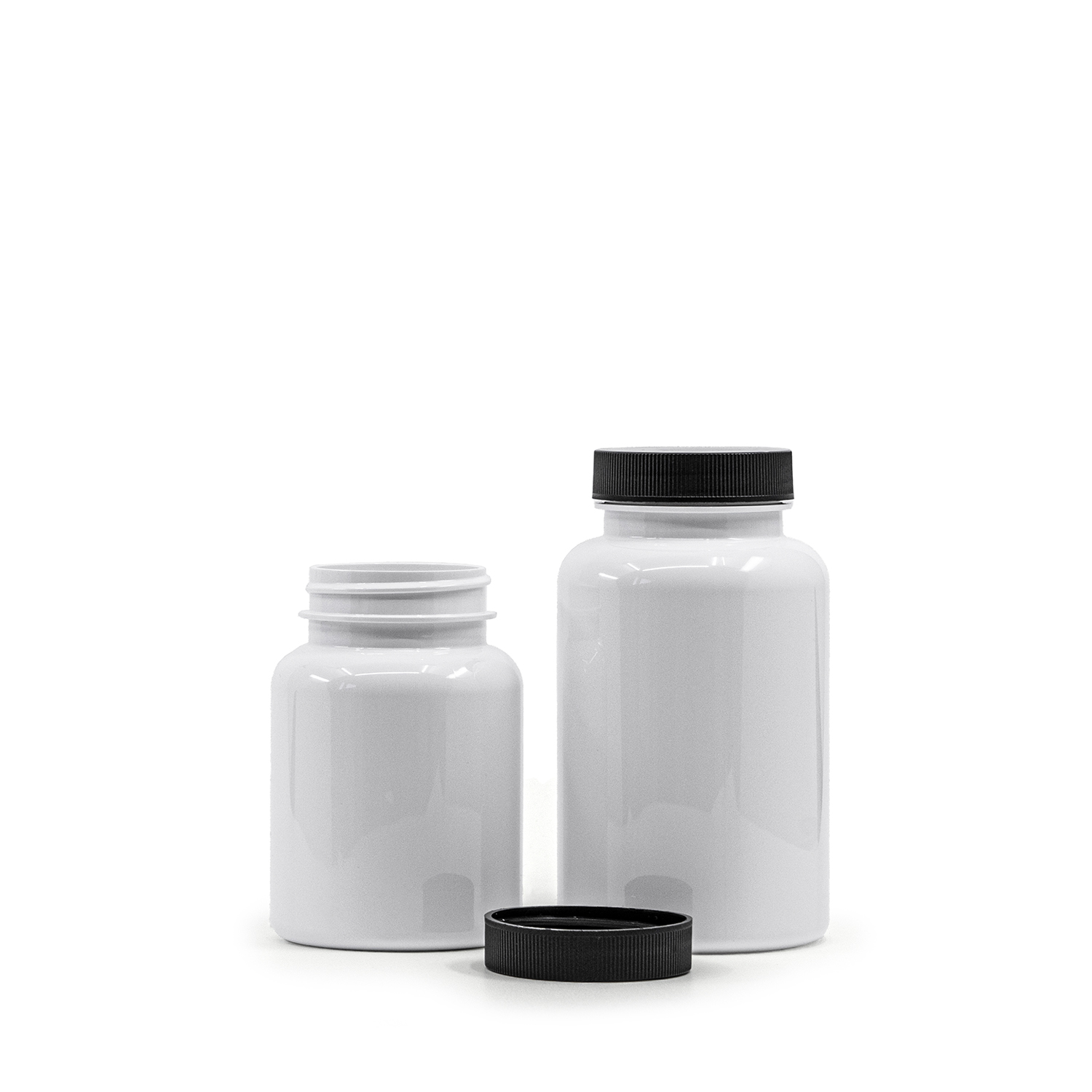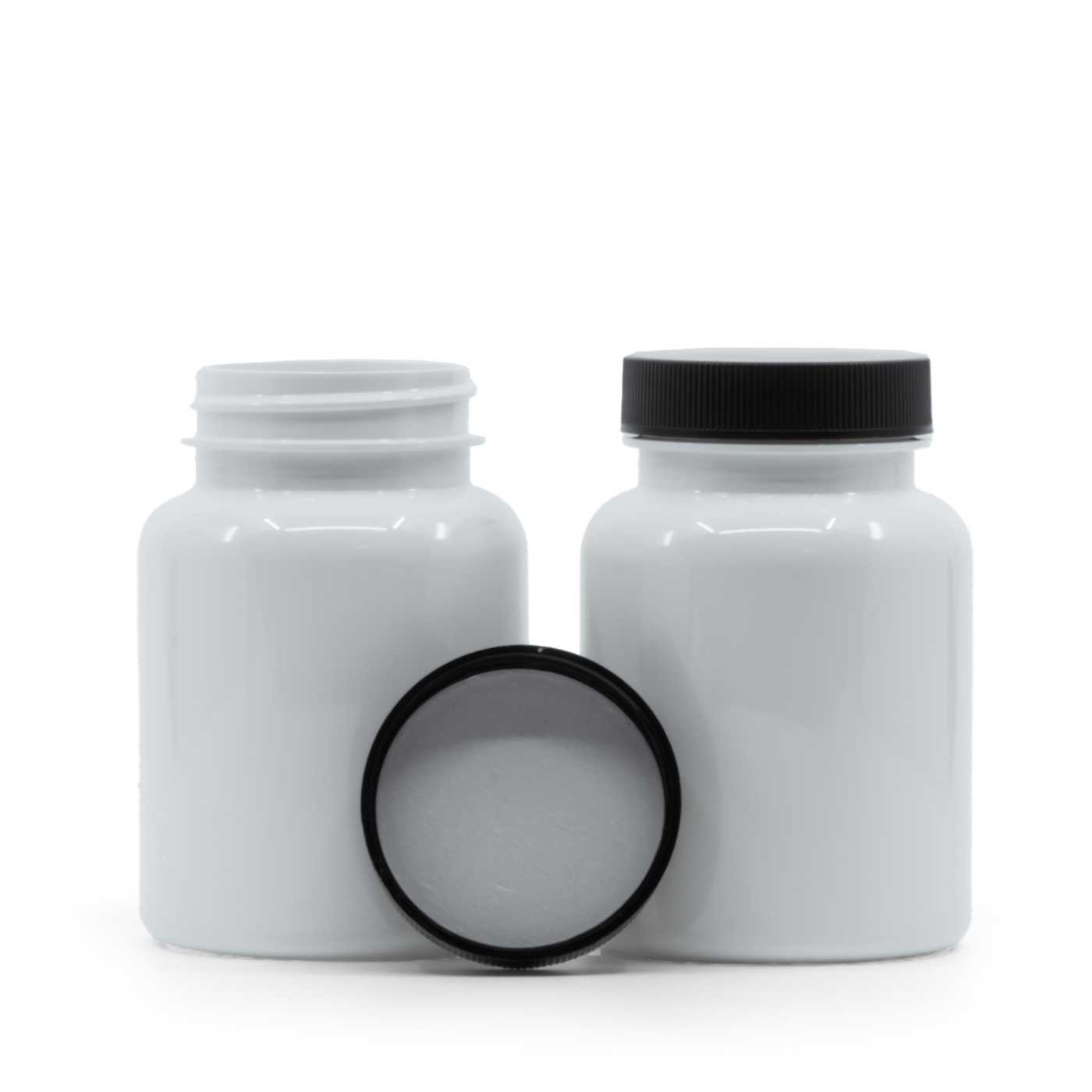 Weißes Kunststoff-Pillenglas, schwarzer Deckel, Induktions-Innendruck, 150 ml