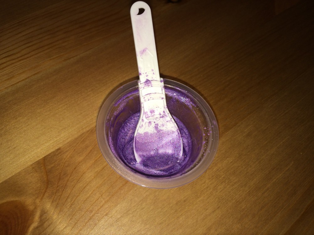 2. Bereiten Sie den Farbstoff vor dem eigentlichen Auflösen der Masse vor. Mischen Sie etwa einen halben Teelöffel Farbstoff in einer kleinen Menge Öl (ich habe Rapsöl verwendet)