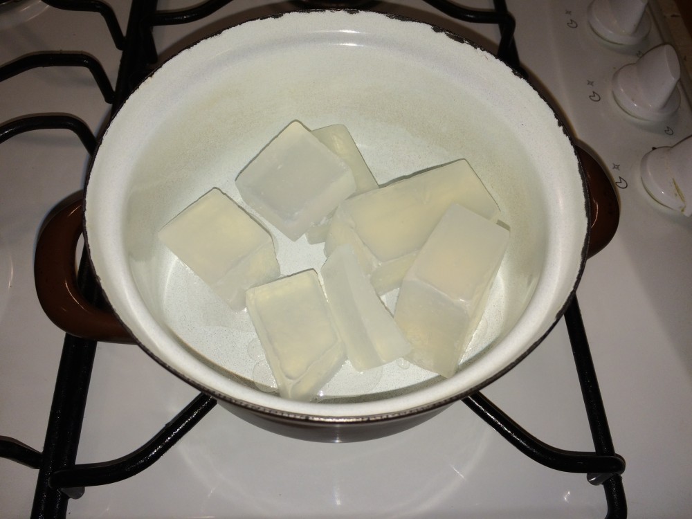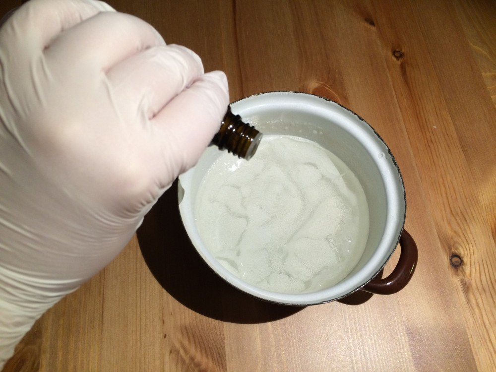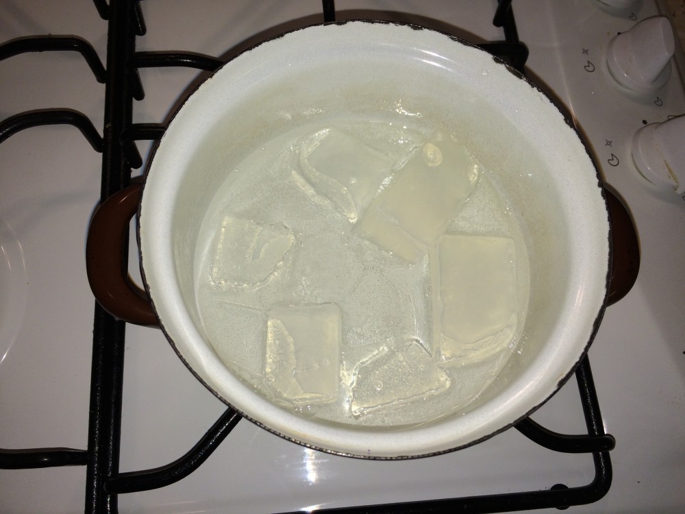 4. Die so vorbereitete Seifenmasse auf kleiner Flamme auflösen, Vorsicht, die Masse darf nicht den Siedepunkt erreichen, sonst wird sie nicht hart.