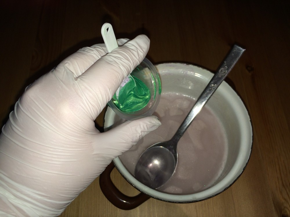 1. Bereiten Sie die notwendigen Zutaten und Werkzeuge vor: Seifenmasse, Farbstoff (Glimmer), ätherisches Öl, Alkohol zum Entfernen von Luftblasen (im Farben- und Lackgeschäft kaufen), einen Becher, in dem Sie die Seifenmasse auflösen, einen Behälter zum Mischen des Farbstoffs, eine Form, einen Löffel, Schutzhandschuhe.