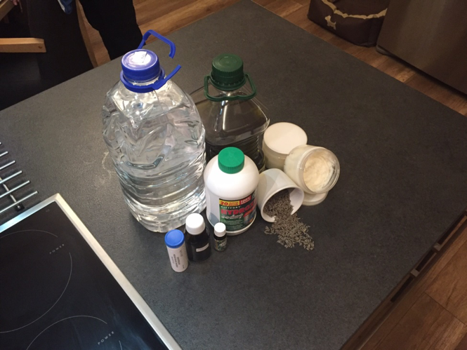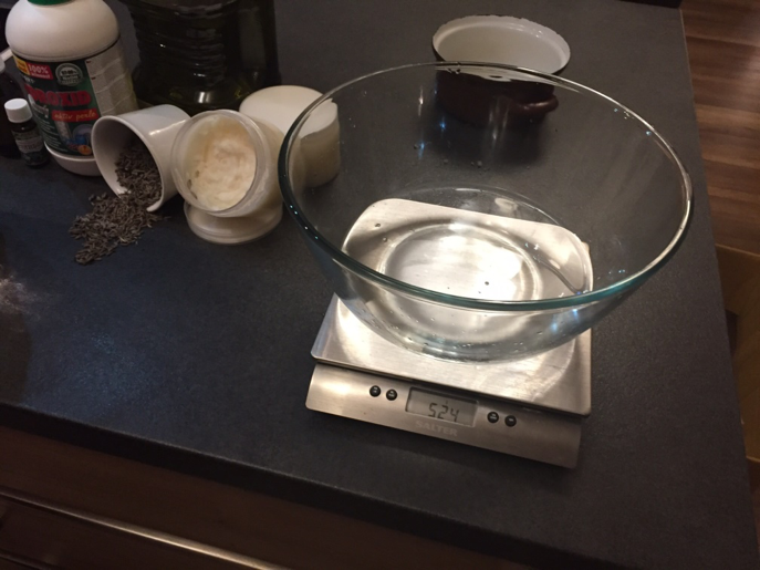 1. Bereiten Sie alle notwendigen Zutaten vor, in unserem Fall destilliertes Wasser und Natriumhydroxid (beide Zutaten können in einer normalen Drogerie gekauft werden), Olivenöl, Kokosnussöl, Rizinusöl, ätherisches Öl - Lavendel, getrockneter Lavendel, pH-Papiere, Thermometer, Schutzausrüstung - Handschuhe, Gesichtsmaske, Schutzbrille
