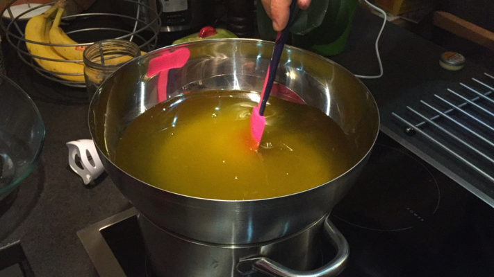 10. Kontrollieren Sie die Mischung kontinuierlich, etwa alle 15 Minuten. Nach und nach findet der Verseifungsprozess statt. Rühren Sie die Seife um, damit sie nicht kocht.