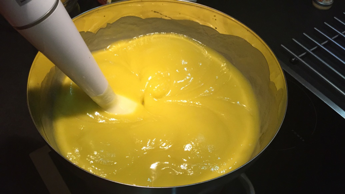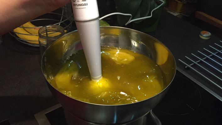 8. Wenn die Öle und das Hydroxid vermischt sind, verwenden Sie einen Stabmixer, um sie zu kombinieren. Mischen Sie, bis sich eine "Spur" bildet.