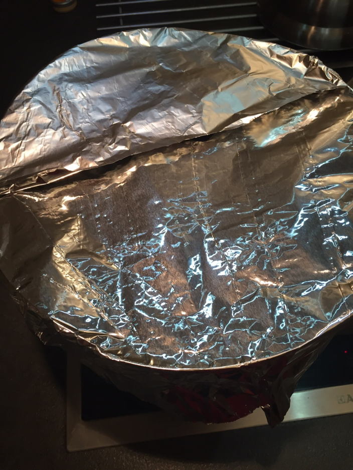 9. Decken Sie die Mischung in der Spur mit Folie ab und lassen Sie sie auf dem Wasserbad bei niedriger Hitze stehen.