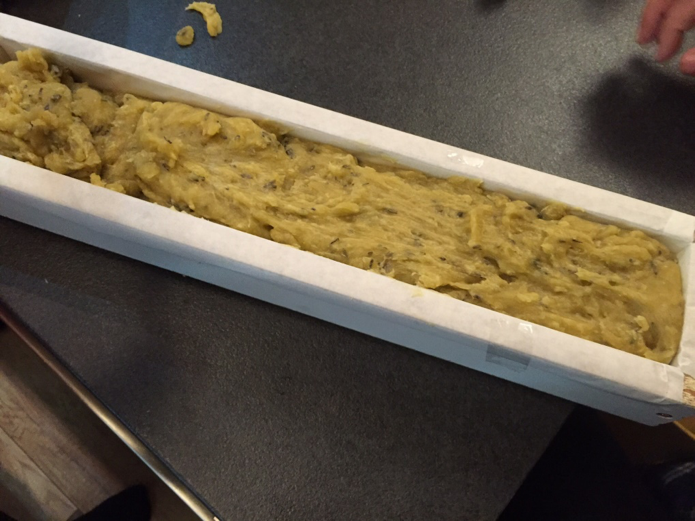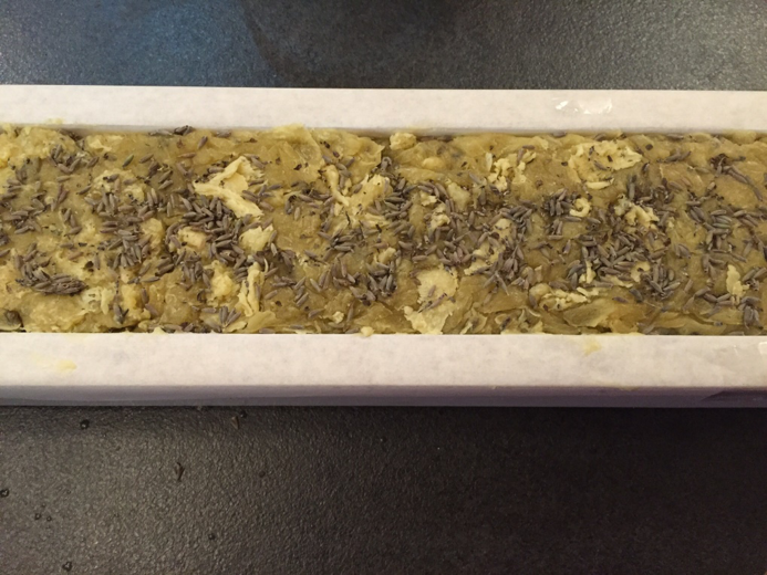 13. Gießen Sie die Seife in ein mit Backpapier ausgelegtes Backblech, wir haben getrocknete Lavendelblüten zur Dekoration verwendet. Decken Sie die fertige Seife ab und lassen Sie sie 24 Stunden lang ruhen.