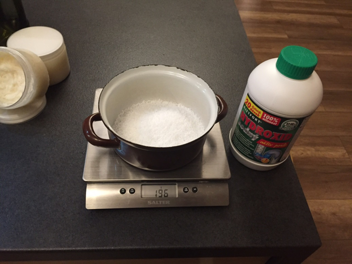 3. Im nächsten Behälter wiegen Sie die erforderliche Menge Natriumhydroxid ab