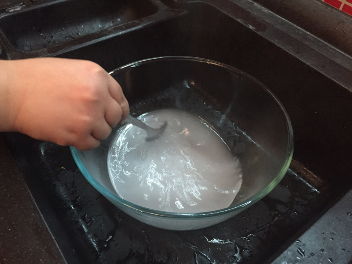 4. Gießen Sie das Natriumhydroxid im Waschbecken in das destillierte Wasser. Achten Sie darauf, dass Sie das Natriumhydroxid IMMER in das Wasser gießen, NICHT IN das Wasser. Rühren Sie das Hydroxid um, atmen Sie die Dämpfe nicht ein. Am besten bereiten Sie die Lösung in einem belüfteten Raum oder bei geöffnetem Fenster zu. Das entstandene Hydroxid hat eine hohe Temperatur, lassen Sie es daher auf etwa 35°C abkühlen