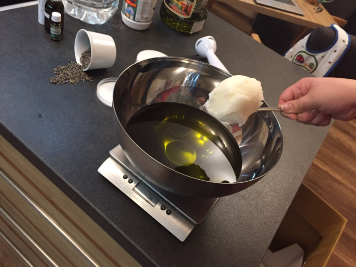 12. Wenn der Verseifungsprozess abgeschlossen ist, nehmen Sie die Seife von der Wärmequelle. Als Nächstes werden ätherische Öle und, in unserem Fall, getrocknete Kräuter hinzugefügt. Ätherische Öle haben unterschiedliche Verdampfungstemperaturen, daher ist es wichtig, dass die Seife eine niedrigere Temperatur hat als die Verdampfungstemperatur des ätherischen Öls. Ätherisches Öl und getrocknete Kräuter hinzufügen.