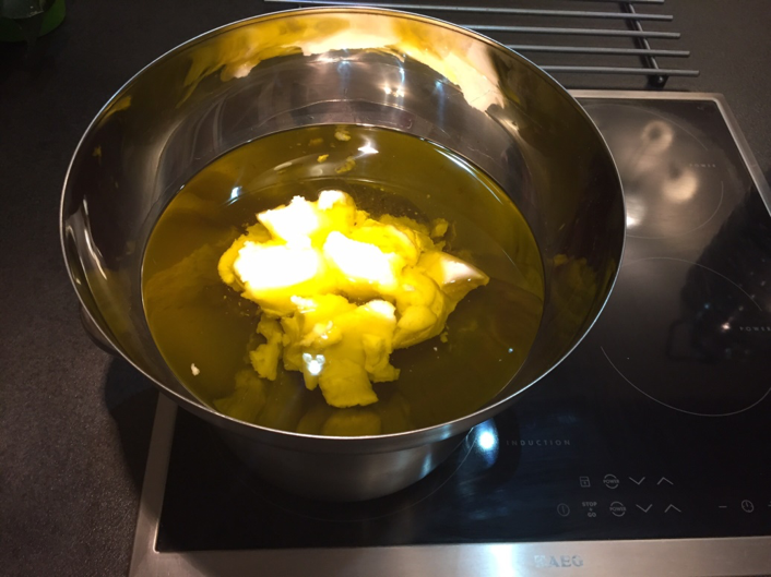 5. Während das Hydroxid abkühlt, bereiten Sie die Ölmischung vor. Wiegen Sie die erforderliche Menge Olivenöl ab und fügen Sie Kokosnussöl und Rizinusöl hinzu. Wir verwenden ein Gefäß, das für ein Wasserbad geeignet ist (in unserem Fall eine Metallschüssel)