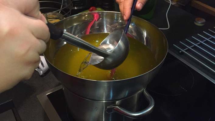 6. Geben Sie die abgewogenen Öle in das Wasserbad und lassen Sie die festen Öle sich auflösen. Die Öle sollten die gleiche Temperatur erreichen wie die Hydroxidlösung.